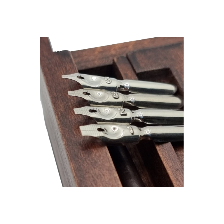Il kit contiene quattro pennini calligrafici diversi, adatti a realizzare tratti sottili o pieni, ideali per scrittura, disegno e lettering con inchiostro. Ogni pennino può essere immerso nell’inchiostro di china per ottenere tratti nitidi e precisi. La varietà dei pennini consente di sperimentare diversi stili e spessori, perfetti per iniziare a creare composizioni calligrafiche.