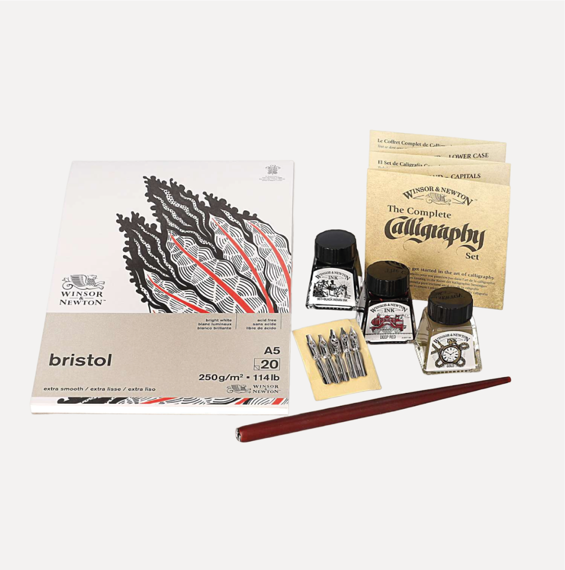Contiene: 3 flaconi di inchiostro da 14 ml nei colori Black Indian, Deep Red e Gold, 1 cannuccia porta-pennino Dip Pen in legno massiccio, 5 pennini per calligrafia ed un blocco Cartridge in formato A5 con 20 fogli, carta liscia da 110 g/mq.