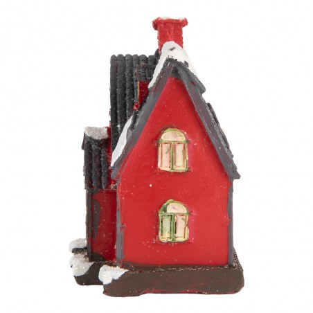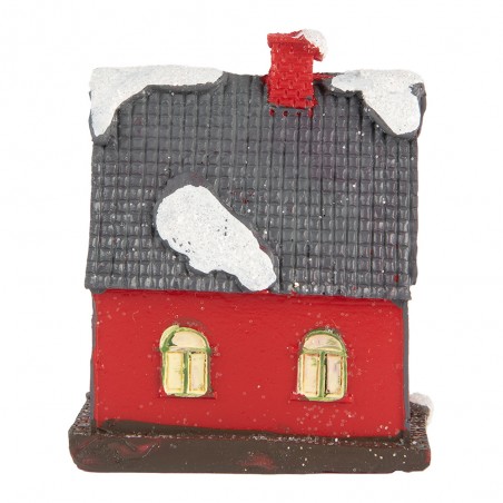 Casetta natalizia rossa con tetto in mattoni coperto di neve.