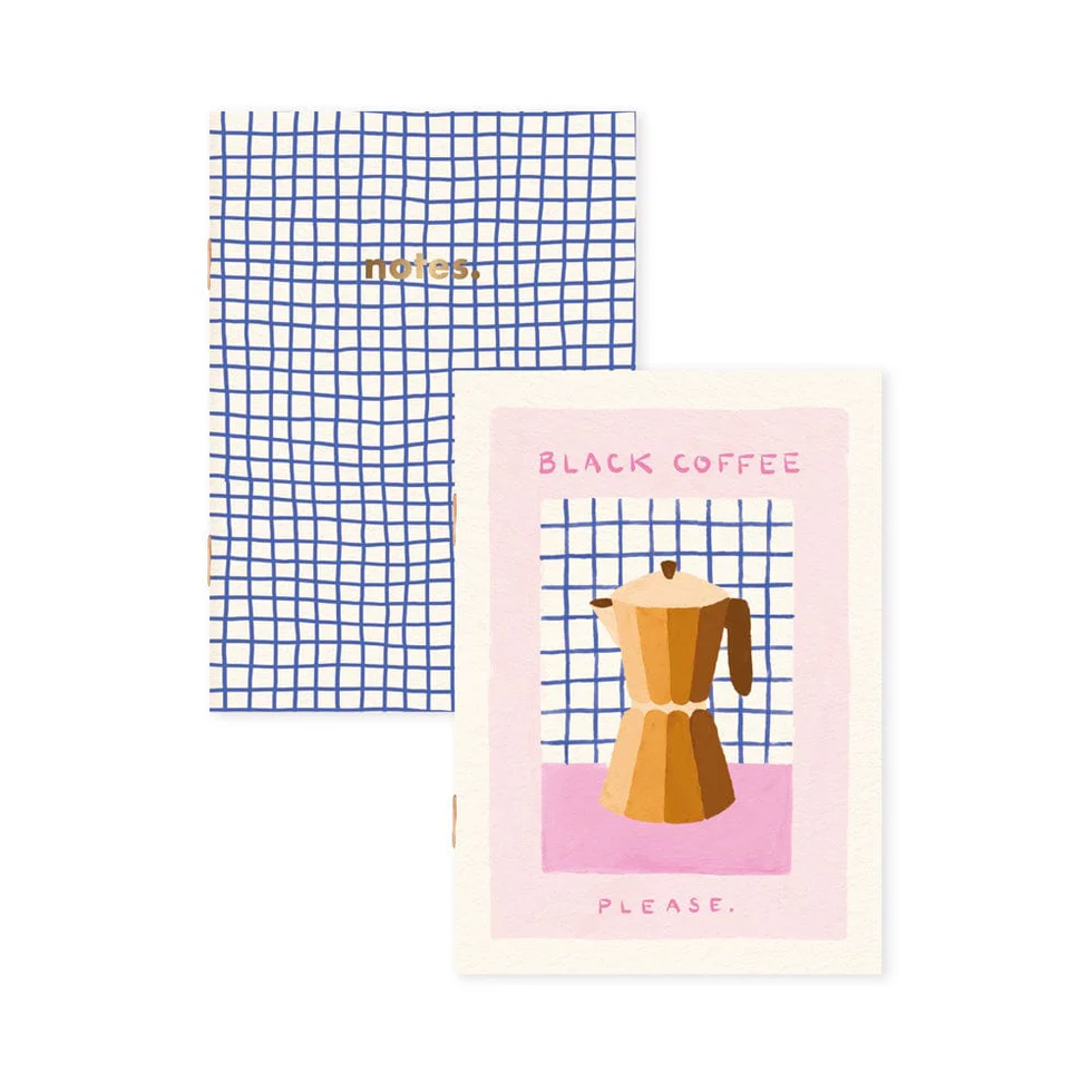 – il delizioso duo di quaderni “Black Coffee” in formato A6. Uno ha una copertina con dei quadratini blu mentre l’altro presenta l’illustrazione di una caffettiera