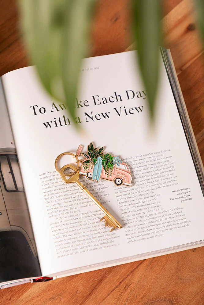 Fuggi in spiaggia con il portachiavi Surf Van. Questo design smaltato colorato, rifinito con dettagli dorati, cattura lo spirito libero delle avventure al mare. Perfetto per aggiungere un tocco di sole e voglia di viaggiare alle tue chiavi o alla tua borsa.