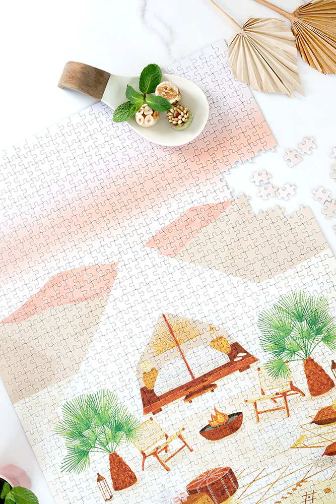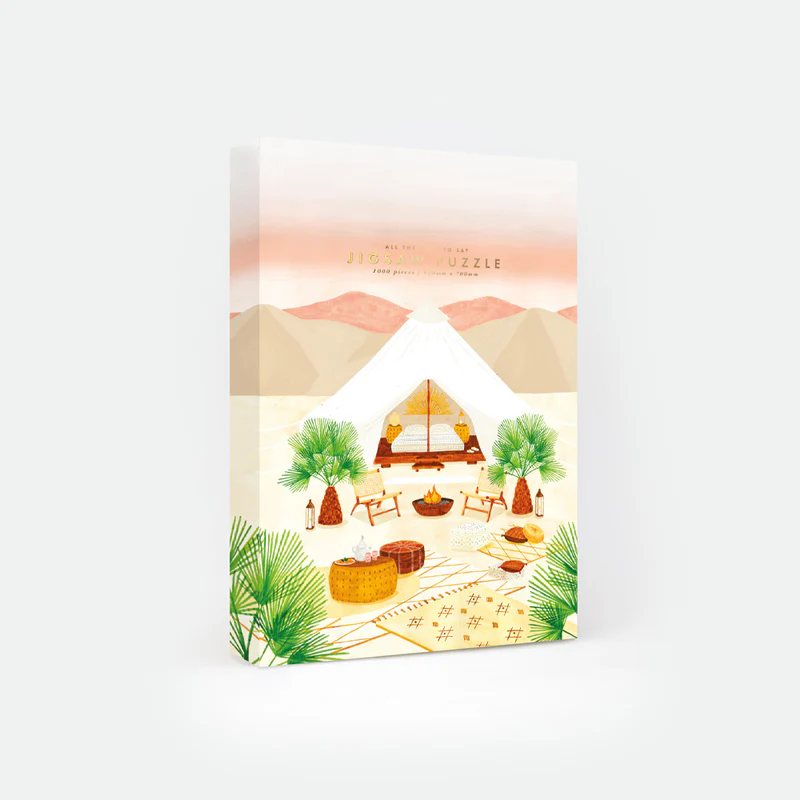 Fuggi in un paesaggio da sogno con il puzzle Glamping da 1000 pezzi e perditi nella bellezza del deserto al tramonto. Pezzo dopo pezzo, scopri tende lussuose incastonate tra le dune, lanterne che brillano dolcemente e un orizzonte che si estende all’infinito sotto le stelle. Una volta completato, forma un’illustrazione di 68 x 49 cm che cattura il calore, la quiete e la magia della vita a cielo aperto.